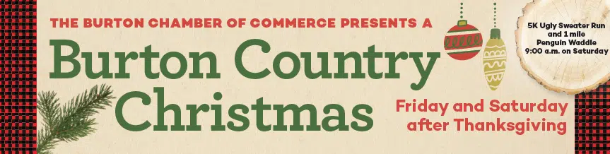 Big holiday spirit, small town magic! Visit Santa at the cabin, take a train ride, get silly at the photobooth, dance to Christmas music, enjoy hot cocoa and more! Join us on Burton Square for Christmas tree lighting and Christmas Light Parade on Friday, November 28, 6:00 pm. Enjoy complimentary cocoa and cookies, take a selfie with Santa and Mrs. Claus at the water tower, and get your four-frame photo of your family and friends at the photobooth located by the cocoa and cookies! The photo is immediately sent to your phone for instant posting! Take a ride on the Christmas Express Train at the Burton Log Cabin, Friday, November 28 from 2-8 pm and Saturday, November 29 from 10-4 pm Holiday photo booth at parade on Friday, November 29 and at the Burton Log Cabin on Saturday, November 29 from 10-2 pm Visit Santa and Mrs. Claus at the Burton Log Cabin Friday, November 28 from 11-4 pm and on Saturday, November 29 from 11-4. Reservations recommended, call the Burton Log Cabin at: 440-834-4204. Saturday, November 29 at 9:00 am. 5K Ugly Sweater Run and 1 Mile Penguin Waddle! 9:00 a.m. Register at gopherarun.com/races or stop in at RE/MAX Rising in Burton. Early Registration: $30. Day of Race: $35. Penguin Waddle: $20. Saturday, November 29: Kris Kringle Mart, 10-5 pm School Yard Studios (the old Berkshire High School) Tired of turkey? The Cousins Maine Lobster truck will be in Burton on Saturday, November 29th from 10-5 pm in the driveway of School Yard Studios! Visit: Burton Chamber of Commerce for more information Follow us on FB at: A Burton Country Christmas.