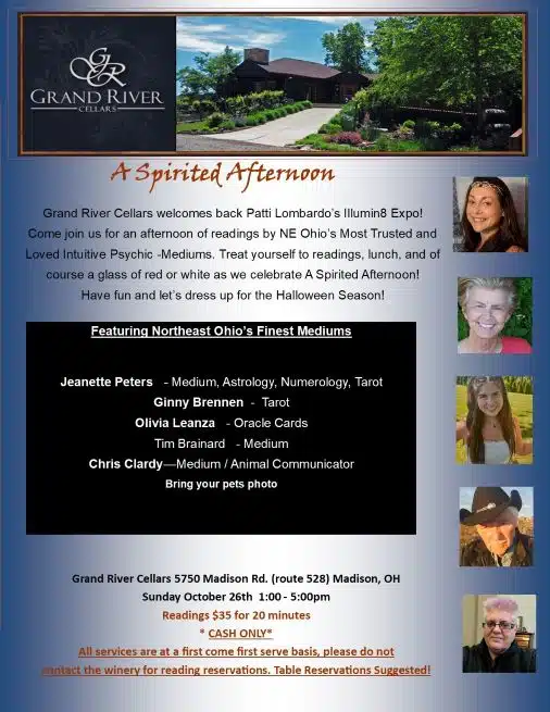 Come join us for an afternoon of readings by NE Ohio’s most trusted and loved Intuitive Psychic Mediums. Treat yourself to readings, lunch and a glass or two of wine! Cash only. Please call the winery for lunch reservations.