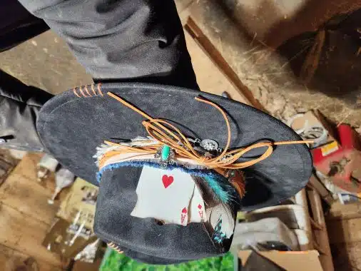At our hat bar party, you will first choose a felt flat brim hat, all adjustable in size. Then pick out your bat band, often layered to add an element of design. We have all colors, sizes and textures to choose from. Then choose accessories to add some flair (feathers, pins, burnt playing cards, etc)! We can hand stitch some embellishments. Finally choose designs to custom burn into the hat, the top and bottom of brim and hat itself can all be burnt! Choose from a catalog of designs, sayings, or even bring your own design idea! You are welcome to do as much or as little of assembling the hat. Some people like to give it a try while others enjoy picking the pieces and having us put it all together. Not a hat wearer? They also make a great wall decoration or customized gift (baby name in nursery, bride to be).