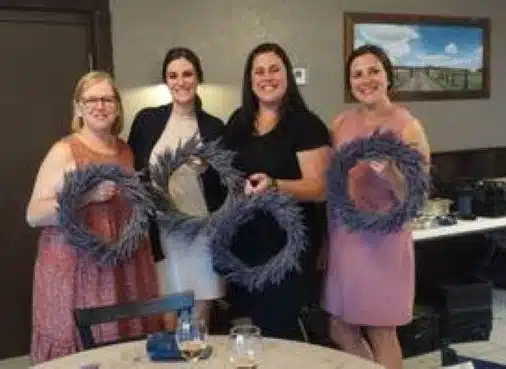 Lavender and Libations: a summer wreath class with Maggie Fusco, longtime wreath maker and proprietor of The Wood Road Salad Farm in Madison, who has been growing lavender and making wreaths and other crafts with it for 20 years on the farm.