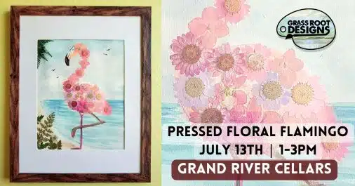 Join your artist Cory at Grand River Cellars in Madison on July 13th to create your own beautiful flamingo art with the use of real pressed flowers and acrylic paints!